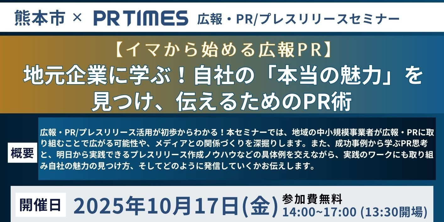 熊本市と株式会社PR TIMESの共催で、『広報・PR/プレスリリースセミナー│【イマから始める広報PR】地元企業に学ぶ!自社の「本当の魅力」を見つけ、伝えるためのPR術』を開催します。