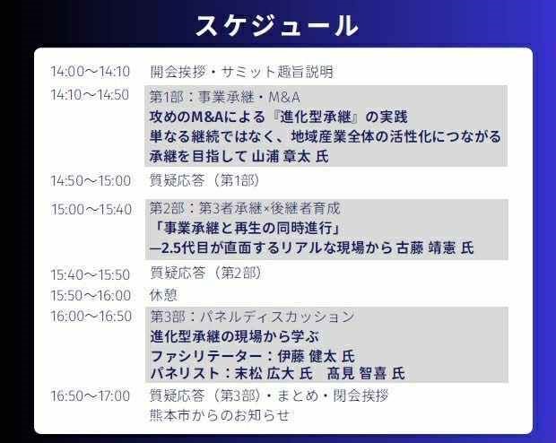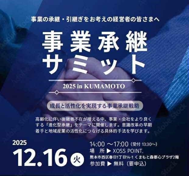DEC 16 2025 事業継承サミット2025 in KUMAMOTO 日時 2025年12月16日(火)14:00〜17:00(受付13:30~) 会場 XOSSPOINT(熊本県熊本市西区春日1丁目14-1 くまもと森都心プラザ2階) 参加費 無料(要申込) 高齢化に伴い後継者不在が増える中、事業・会社をより良くする「進化型継承」をテーマに開催します。 意識改革の早期着手と地域産業の活性化につなげる具体的な手法を学びます。 タイムスケジュール 場所 場所:XOSS POINT.(熊本市西区春日1丁目14-1 くまもと森都心プラザ2階) こんな方におすすめ ■中小企業経営者・後継者 ■地域産業の関係者・支援者 ■経営幹部・役員 ■成長や事業拡大を目指す経営者 ゲスト お申込み お申し込みはこちら Tweet Share Hatena Pocket RSS feedly Pin it 地域資源を”物語”で商品化する! ... "Global Idea Lab ...