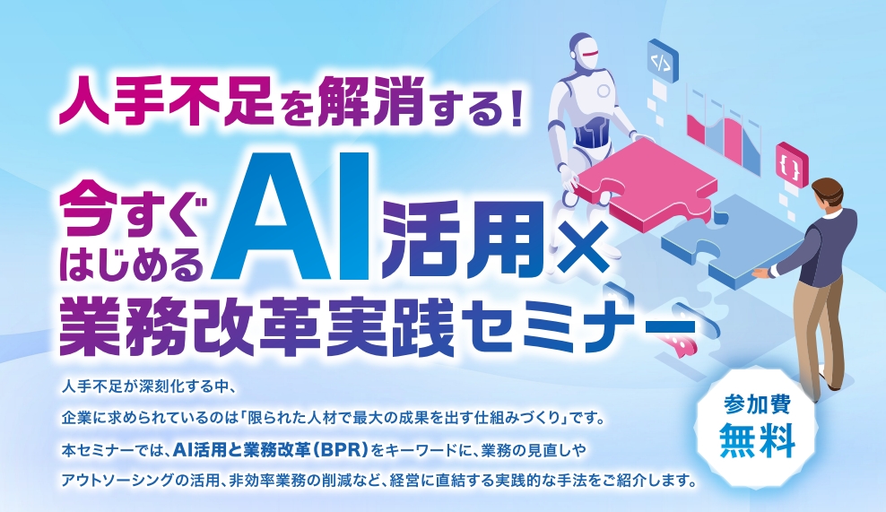 2025.10.27 人手不足を解消する!今すぐはじめるAI活用×業務改革実践セミナー 日時 2025年10月27日(月)16:00〜18:00 会場 XOSSPOINT(熊本県熊本市西区春日1丁目14-1 くまもと森都心プラザ2階) 参加費 無料 人手不足が深刻化する中、企業に求められているのは「限られた人材で最大の成果を出す仕組みづくり」です。 本セミナーでは、AI活用と業務改革(BPR)をキーワードに、業務の見直しやアウトソーシングの活用、非効率業務の削減など、経営に直結する実践的な手法をご紹介します。 対象者 熊本市内の中小企業。 30名限定(オンライン参加もOK) ※応募者多数の場合は抽選となります。 概要 日程:2025年10月27日(月)16:00~18:00 場所:XOSS POINT.(熊本市西区春日1丁目14-1 くまもと森都心プラザ2階) プログラム 【第一部】AIで広がる業務効率化 【第二部】体験型ワークショップ | 業務の「見える化」 【第三部】外部リソース活用による業務効率化 講師 福島屋代表 / くまもと中小企業デジタル相談窓口(熊本県商工会連合会設置)専門家 福島 賢 お申込み こちら 募集締め切り 令和7年(2025年)10月26日(日) お問い合わせ みらい株式会社 くまもと事務局 【お電話】0969-24-8775 【メール】kumamotoinfo@mirai-forol.jp Tweet Share Hatena Pocket RSS feedly Pin it 外部専門人材活用セミナー参加企業募... StartupWeekend 熊本...