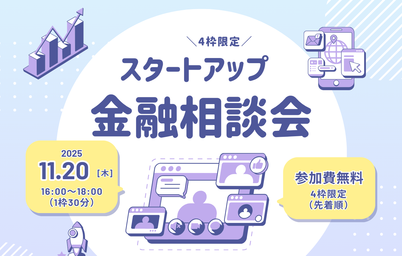 2025.11.20 【4社募集】スタートアップ金融相談会 日時 2025年11月20日(木)16:00〜18:00 会場 XOSSPOINT(熊本県熊本市西区春日1丁目14-1 くまもと森都心プラザ2階) 定員 4社・者(先着順、1枠あたり30分) 「自分の事業は融資を受けられる?」 「スタートアップとして投資を受けたいが、どのように動いたら良いか分からない」 といったお悩みをお持ちの企業・個人を対象に、XOSSPOINT.では地元銀行やベンチャーキャピタルによるスタートアップ金融相談会を不定期で開催しています。 今回は「熊本銀行」のスタートアップ担当者が1日限定で相談窓口を開設します。カジュアルに銀行の担当者と相談できる場です。ぜひご活用ください! ※残り3枠です!お早めにお申し込みください。 こんな方におすすめ ・起業を考えており、融資や投資を希望する企業 ・融資や投資を希望するスタートアップ企業 ・事業拡大を前に資金計画を相談したい企業 など 概要 日程:2025年11月20日(木)16:00~18:00 場所:XOSS POINT.(熊本市西区春日1丁目14-1 くまもと森都心プラザ2階) 講師 熊本銀行 猪俣氏 お申込み・お問い合わせ an-fukagawa@kumanichi.co.jp (担当:深川) Tweet Share Hatena Pocket RSS feedly Pin it 応援される創業者になるために ~金... 集客とマネタイズのためのWEBコン...