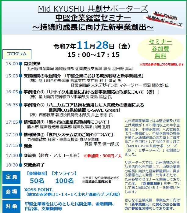 九州経済産業局では、中堅企業及び売上げ規模が100億円を超える中小企業(以下、中堅企業等)への支援をより一層強化し、中堅企業等の成長を通じた地域経済の活力向上に資することを目的として「Mid KYUSHU共創サポーターズ(以下、サポーターズ)」という支援機関のネットワークを創設し、活動しております。