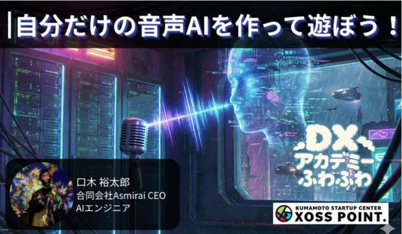 2026.02.13 自分だけの音声AIを作って遊ぼう! 日時 2026年2月13日(金)19:00〜21:00 会場 XOSSPOINT(熊本県熊本市西区春日1丁目14-1 くまもと森都心プラザ2階) 参加費 無料 生成AIの進化は、テキストや画像だけでなく「音声」の世界にも革命を起こしています。最新のオープンソースモデルが登場したことで、専門的な機材や膨大な学習データがなくても、わずか数分の録音から「自分そっくりの声」を再現することが可能になりました。 本勉強会では、音声合成AI「GPT-SoVITS」を使い、Google Colab上で自分の声をデジタル化するハンズオンを行います。「AIに自分の声を喋らせてみたい」「音声合成の仕組みを体験してみたい」という初心者の方に向けて、AIによる声の生成に関して分かりやすく解説します。 「技術を学ぶ」だけでなく、実際に「作って遊ぶ」体験を通じて、AI時代の新しい自己表現の形を一緒に探りましょう。 こんな方におすすめ ■音声合成AIやボイスクローン技術に興味があるが、何から始めればいいかわからない方 ■Google Colabを使って、最新のAIモデルを動かしてみたい方 ■自分の声をAI化して、動画制作や配信、自分専用のアシスタントなどに活用してみたい方 ■最新のAIトレンドを、手を動かしながら楽しく学びたい方 ■熊本の学生・エンジニアで、AI技術のコミュニティに興味がある方 必要なもの ■WiFi接続可能なノートパソコン ■Googleアカウント(Google Colabを使用します) ■自分の声の音声データ ・1分程度の音声 ・ノイズが少ない方が良いです ・事前に会話や朗読などの音声を録音してきてください ■Webブラウザ(Google Chrome推奨) タイムテーブル ■19:00~ 開場・受付 ■19:10~ 音声AIの現在地: なぜ自分の声がAIで作れるのか? ■19:30~ 実践ハンズオン: GPT-SoVITSで「AIの自分」を生成してみよう! ■20:30~ 質疑応答・交流 発表者 講師:口木 裕太郎 合同会社 Asmirai 代表 / AIエンジニア 熊本大学発ベンチャーとして、実務でのAI活用やプロダクト設計に従事。AI技術を「単なる道具」ではなく「創造性を拡張するパートナー」として普及させるべく活動中。 お申込み お申し込みはこちら! Tweet Share Hatena Pocket RSS feedly Pin it BUSINESS XOSS CAF... 知財で地域が動き出す 熊本市「ちざ...