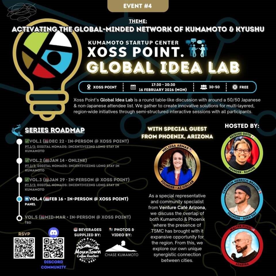 With TSMC’s arrival, the world is watching Kumamoto. Here’s a space to connect across languages and cultures. We’re bringing Melissa from Phoenix — where she’s been building startup ecosystems — to explore one question together: what kind of community does Kumamoto need?