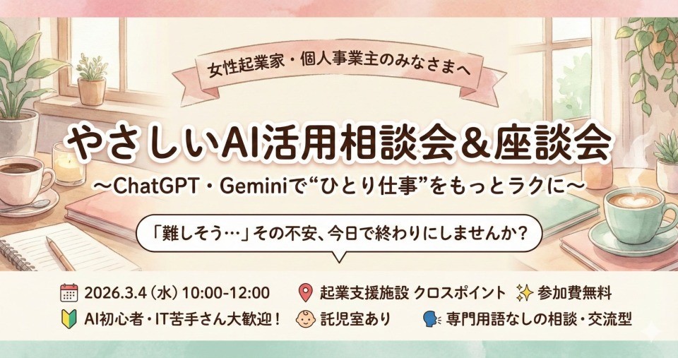 2026.03.04 女性起業家・個人事業主のためのやさしいAI活用相談会&交流会~ChatGPT・Geminiで”ひとり仕事”をもっとラクに 日時 2026年3月4日(水)10時00分~12時00分 会場 XOSSPOINT(熊本県熊本市西区春日1丁目14-1 くまもと森都心プラザ2階) 参加費 無料 近年、ChatGPTやGeminiなどの生成AIが注目されている一方で、 女性起業家・個人事業主の方から、以下のような声が多く聞かれます。 ■ AIに興味はあるが、何に使えるのかわからない ■ 少し触ってみたが、仕事にどう活かせばいいかわからない ■ 一人で調べるのは不安で、誰かに相談しながら進めたい 特に、主婦起業家や子育て中の方にとっては、 日々の業務を効率化し、「考える時間」「作業時間」を短縮することが大きな課題です。 本企画では、専門用語や難しい説明を極力避け、 実際にアプリを触りながら体感できる「相談型イベント」 として、 AI初心者の方でも安心して参加できる場を提供します。 対象者 ■ 女性起業家 ■ 個人事業主 ■ 起業を検討中の方 ■ 主婦起業家・子育て中の方 ※ AI初心者歓迎 参加形態 ■ 参加無料(事前申込制) ■ 託児室あり ■ 持ち物:PC・スマートフォン持参 -(任意) こんな方におすすめ ■ ChatGPT / Geminiの基本的な使い方の情報を知りたい ■ 実際の業務で困っていることの相談 ■ 「こんなことAIに聞いていいの?」という初歩的な質問 本企画の特徴 ■ 午前開催(10:00〜12:00)で託児室もあるので子育て中の方も参加しやすい ■ 相談・交流型のため一方通行にならない ■ AI初心者を前提とした「やさしい」内容設計 参加者が得られる効果 ■ AIに対する不安・苦手意識の軽減 ■ 自分の事業にAIをどう活かせるかの具体的イメージ ■ 今日から試せる実践的なヒント ■ 女性起業家・個人事業主同士のつながり 主催・運営体制 ■主催 WizTry株式会社 ■会場協力 起業支援施設 クロスポイント 講師・ファシリテーター WizTry株式会社 生成AI・DX活用支援担当者 (企業・個人向けAI活用支援・研修実績あり) お申込み お申し込みはこちら! Tweet Share Hatena Pocket RSS feedly Pin it DXハッカソン説明会&ミニハッカソ... 大学生と楽しく学ぼう!アントレプレ...
