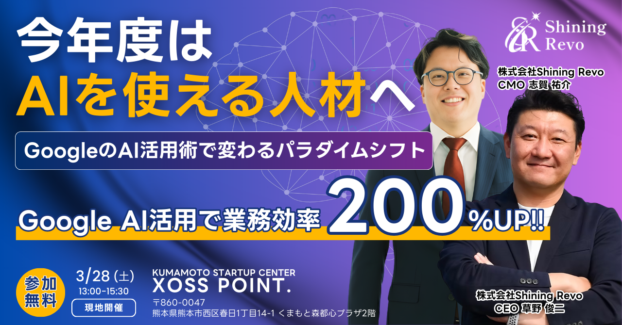 2026.03.28 今年度は”AIを使える人材”へ GoogleのAI活用術で変わるパラダイムシフト 日時 2026年3月28日(土)13:00~15:30 会場 XOSSPOINT(熊本県熊本市西区春日1丁目14-1 くまもと森都心プラザ2階) 参加費 無料 新年度、あなたの会社と業務を『AI活用の業務効率化』にアップデートしませんか? 4月から始まる新年度。「AIを使える人材」と「そうでない人材」の生産性の格差は、決定的なものになります。 「AIツールは知っているが、実務で使いこなせていない」 「AI導入と言われても、何から手を付ければいいかわからない」 もし一つでも当てはまるなら、このセミナーが“最短の解決策”です。 講師 ■株式会社Shining Revo CEO 草野 俊二 氏 ■株式会社Shining Revo CMO 志賀 祐介 氏 講師を務めるのは、国内最大級のAI活用コミュニティ「SHIFT AI」に所属し、最新事例を常にキャッチアップしている株式会社Shining Revo。 熊本を拠点に、AIを活用した業務効率化を主体として企業に対してコンサルを目的とした活動を行っており、さらに業務効率化を目的としたシステム開発やクリエイティブ制作を事業として活動。 必要なもの PC持参 企画概要 本セミナーでは、Googleのサービスである「Gemini(ジェミニ)」と膨大な資料を瞬時に分析する「NotebookLM」などをメインにお伝えしていきます。 普段お使いのGoogleツール(ドキュメントやスプレッドシートなど)と直結するGoogleのAIは、数あるAIサービスの中でも日常のツールの延長として中小企業が最も導入しやすく、効果が出やすいツールです。 PC持参で「明日使える」状態へ 座学だけではありません。後半はPCを使った実践ワークショップを実施。 「議事録の要約」「企画書の作成」「社内ナレッジの整理」など、翌日の業務ですぐに使えるプロンプト(指示文)をその場で習得していただきます。 お申込み お申し込みはこちらから! Tweet Share Hatena Pocket RSS feedly Pin it BUSINESS XOSS CAF... ゼロからはじめる 資金調達実践講座...